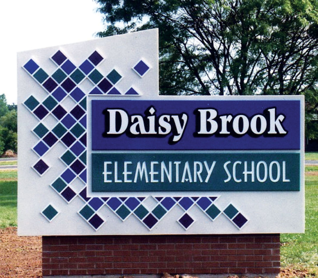 Cutout <a href="/recommends/signfoam" target="_blank" rel="noopener noreferrer">Sign·Foam 4 HDU board</a> graphics on a monument of Durock sheets over a wood frame sprayed with stucco and mounted on a brick base
