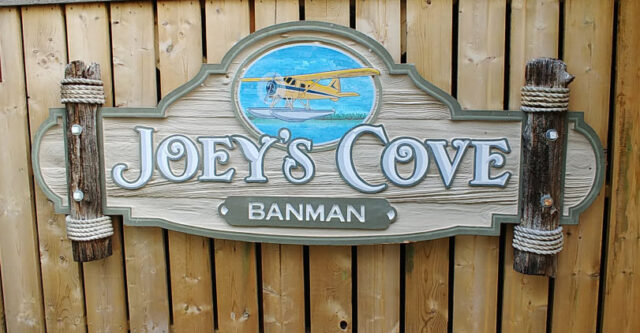 Sandblasted western red cedar and hand painted. The sign was made in 2004 and this photo is from 2019.