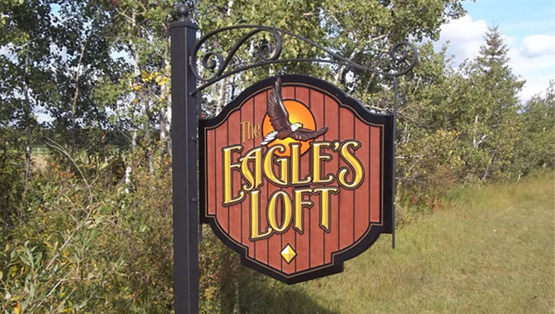 Handpainted sandblasted western red cedar sign mounted on custom steel frame and bracket