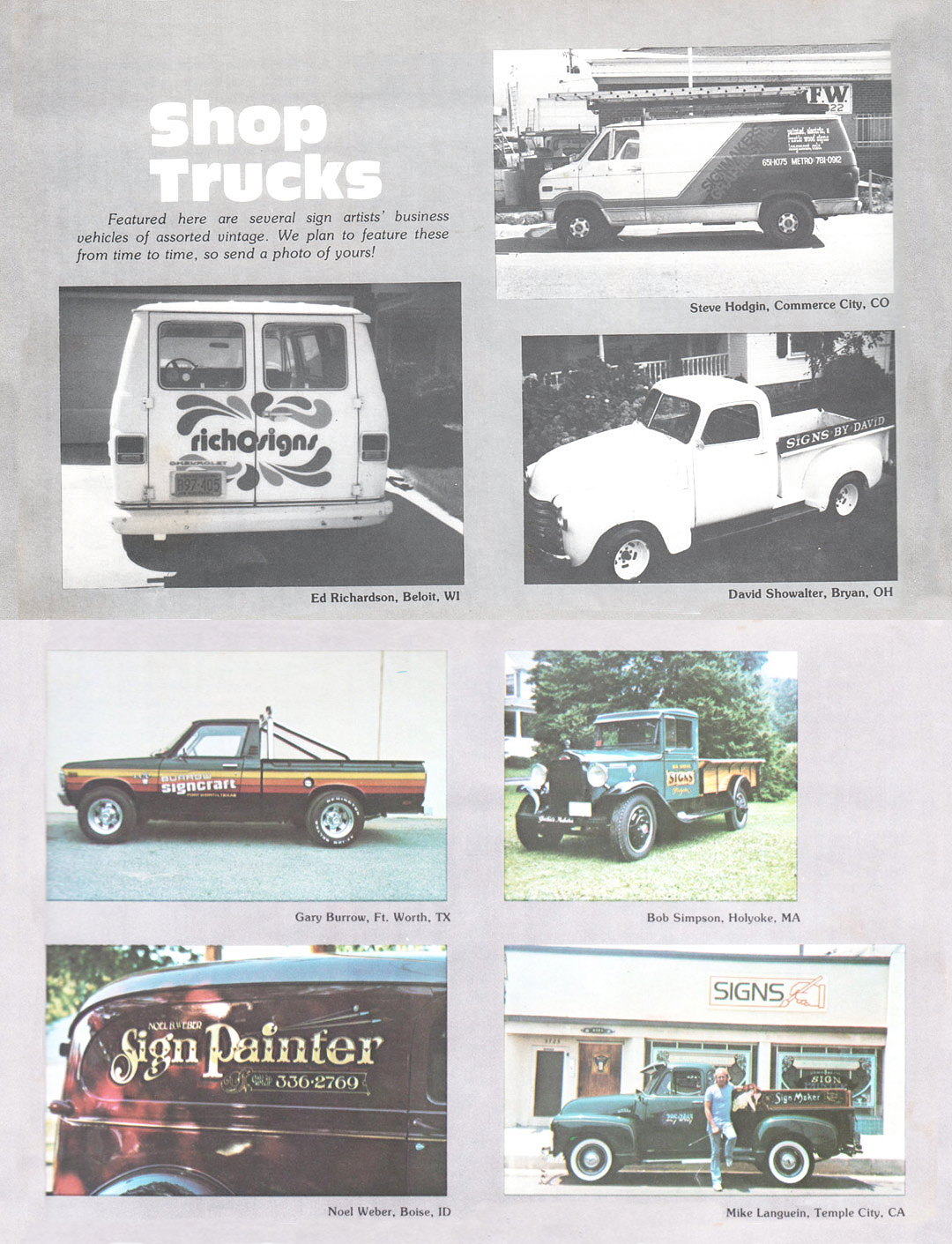 In 1980, during SignCraft magazine’s first year, we began inviting sign people to send photos of their best piece of advertising: their shop truck. They took us up on the offer and over the next 45 years, they sent us hundreds, maybe thousands, of photos of their shop vehicles. Starting in issue No. 8, we began featuring a page or two of them whenever we had the space.