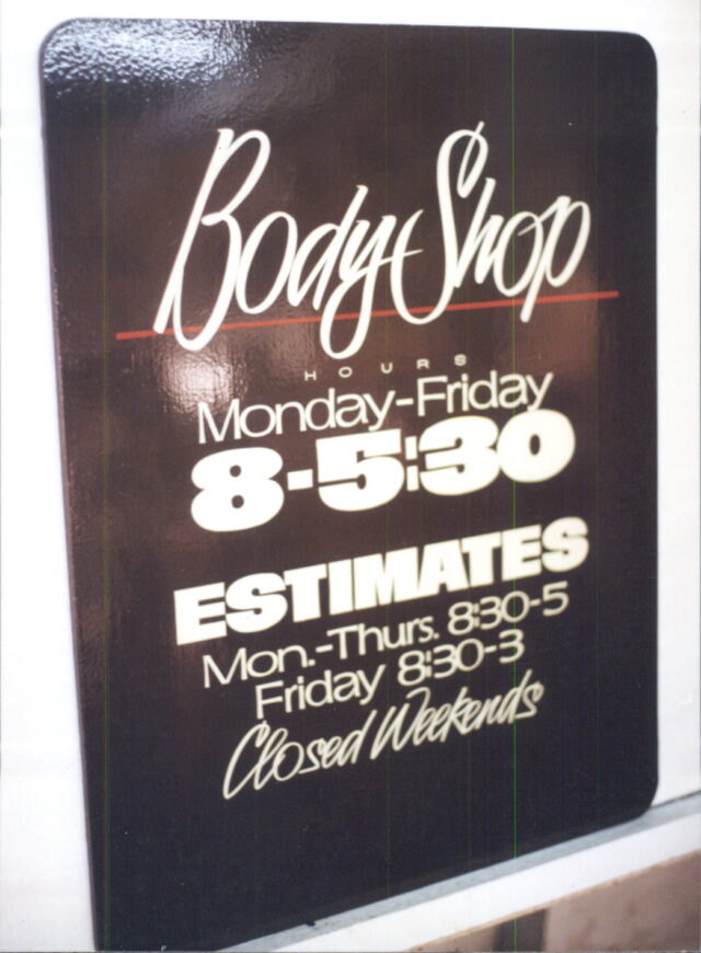 Changes in the business: I haven’t done much hand lettering for the past 15 or 20 years. Computers and vinyl changed all that in the late 1980s. Calls for painted signs were becoming fewer. I continued sign painting windows, trucks, banners, overlaid plywood signs and wall work, but other types of sign work were taking me more and more away from brush work. I was doing dimensional letters, sandblasted signs, even electrical signage on occasion.