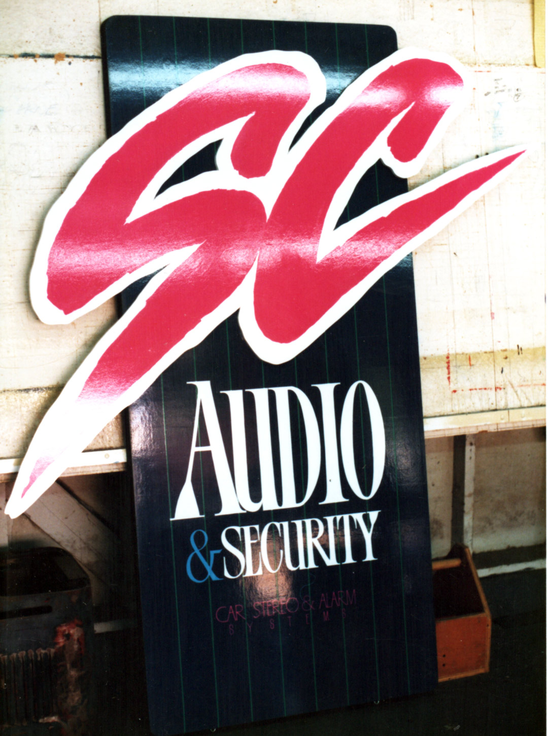 Window sign with airbrushed graphics, c. 1982
