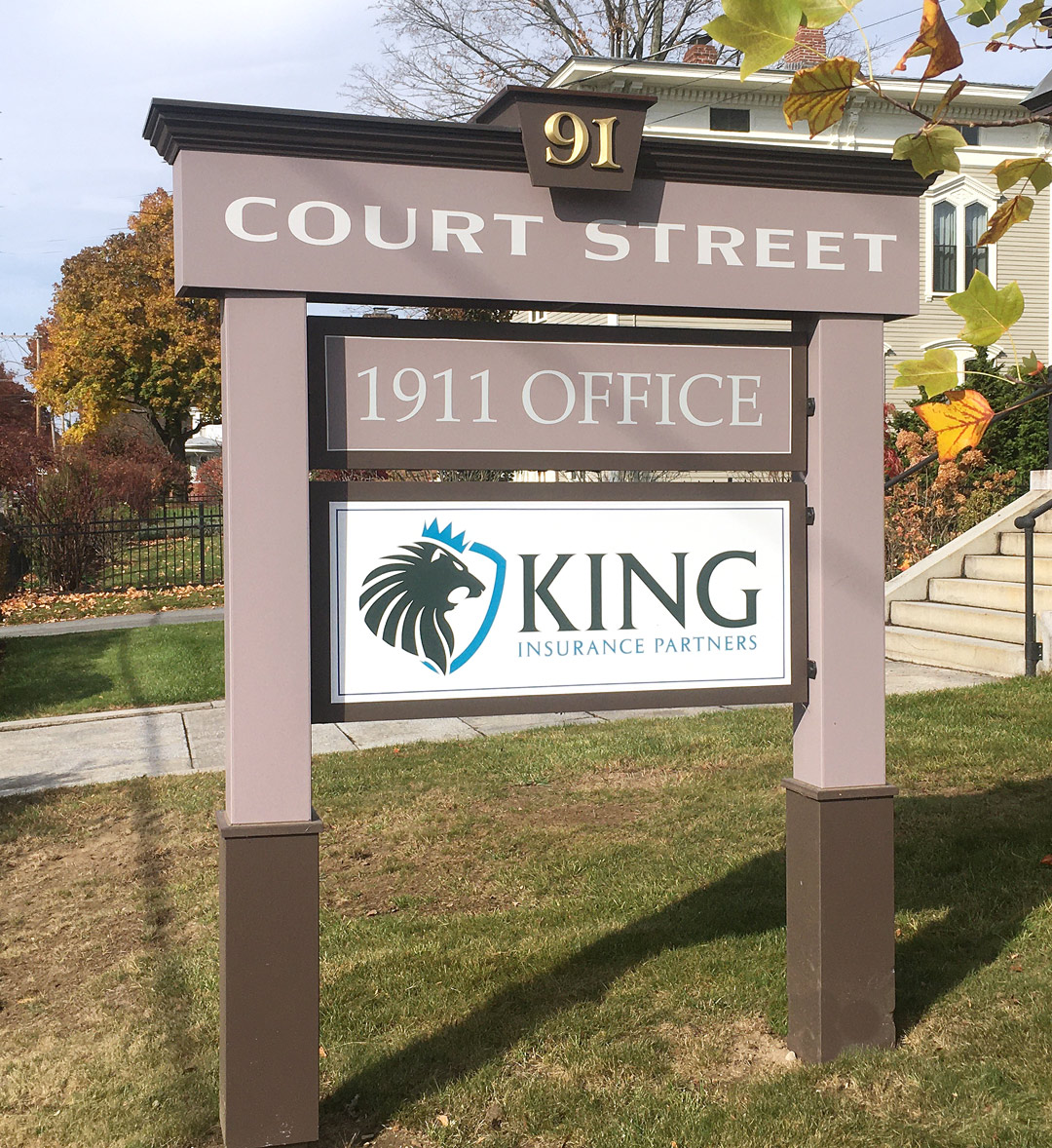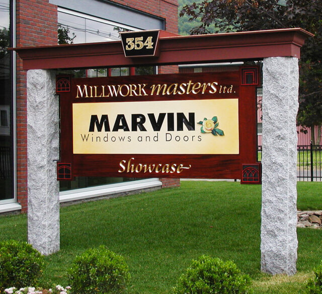 “This is the sign that caught the eye of the client at 91 Court St. It has raised letters, carved medallions on the corners and a sandblasted background. The client wanted the sign to be lighted from above but didn’t want to see any wiring. We had to have the granite company drill a hole lengthwise through the granite post to accept the wire, which was costly.