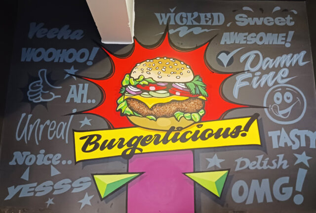 This next internal wall project was done in a Queensland pub and they requested it “loud and colorful.” Who ya gonna call? It was hand-painted in low-sheen acrylics. The hamburger outline and “Burgerlicious” were projected. I wanted to use Jeff Marshall’s beautiful script but was unsure of a faithful reproduction if done entirely freehand.