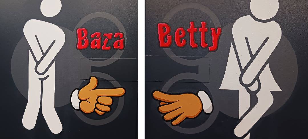 After “Burgerlicious” they then asked me to do Male and Female restrooms murals in the party area behind the pub. This was the local backpacker hangout with a huge stage and dance area where very inebriated Irish, English and German tourists partied hard. I felt this was no place for your standard “Gentlemen” and “Ladies” as in truth, neither was to be found there—LOL! A quick Google search produced the two hilarious white “anxious icons” which I projected up onto the single wall (about 1500mm [or 5 ft.] tall) that divided the two rooms.