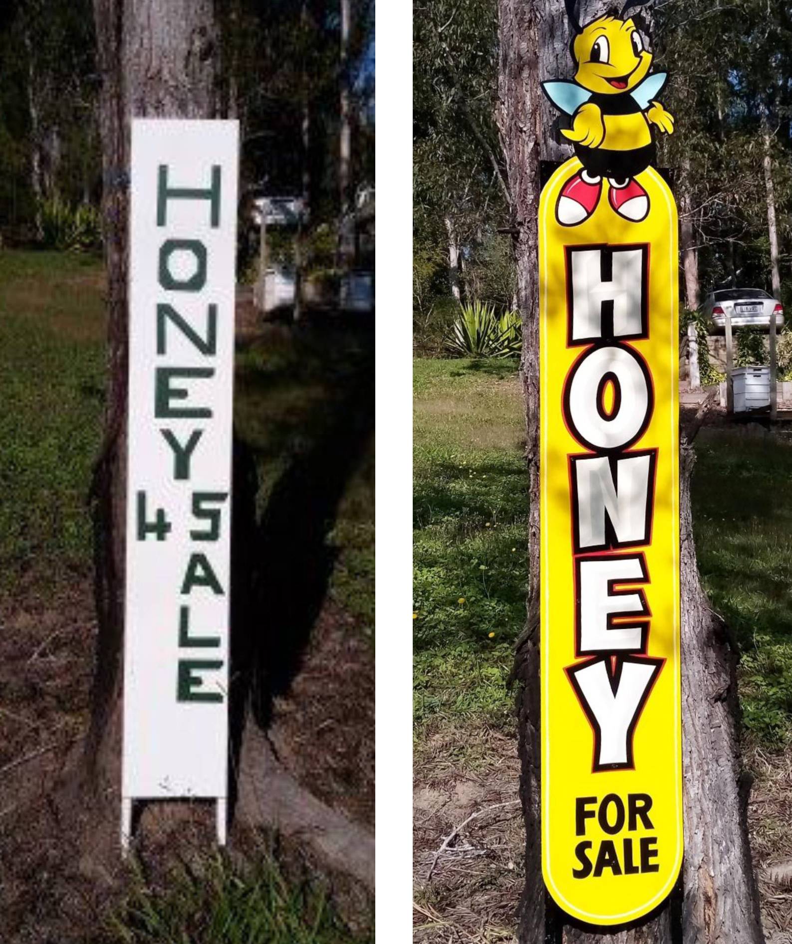 This next job was for a lovely old couple who I used to buy honey from. The man of the house had proudly done the black-and-white version of their sign but they continually mentioned that sales were less than what they wanted. I had some scrap ACM so I suggested I could “add a bit of color” to their sign to help increase business. I didn’t charge them anything and simply screwed the new sign over the old one on my next visit, saying that I “added a bit of color” to their sign.