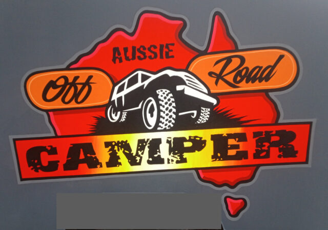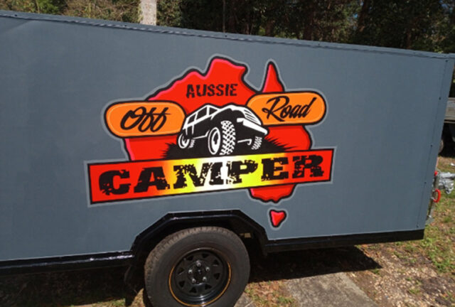 This was for a home-built camper trailer that needed an eye-catching logo design on either side. I drew the design by hand first on A4 paper, photographed it with my phone then projected it onto both sides of the trailer, which had a flat epoxy finish. After projecting the layout, I lightly scuffed the areas to be lettered with fine sandpaper. I hand painted it, first with water-based undercoat/primer then with low-sheen acrylics. It was clear-coated with two-pack automotive paint, which is paint and an activator.