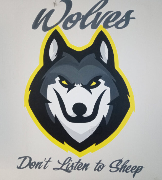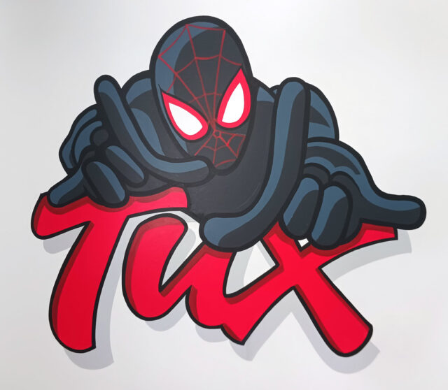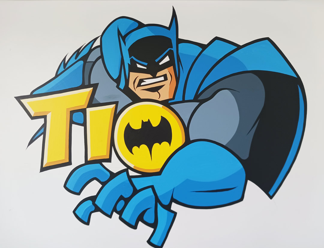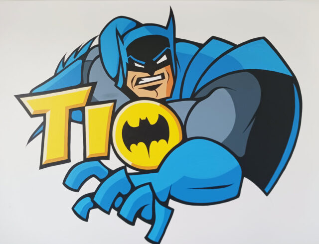The Tux and Tio interior wall murals were done for the sons of a friend. Each told me their favorite super heroes, so I Googled examples and selected the ones that allowed me to slot in their names as well. I screen-shot them, cropped the image then projected it and did a rough pencil outline of the characters. I then freehanded in their names with hand-drawn letter styles that I felt suited the graphic. They were painted in my low-sheen acrylics then clear-coated with a water-based anti-graffiti clear.