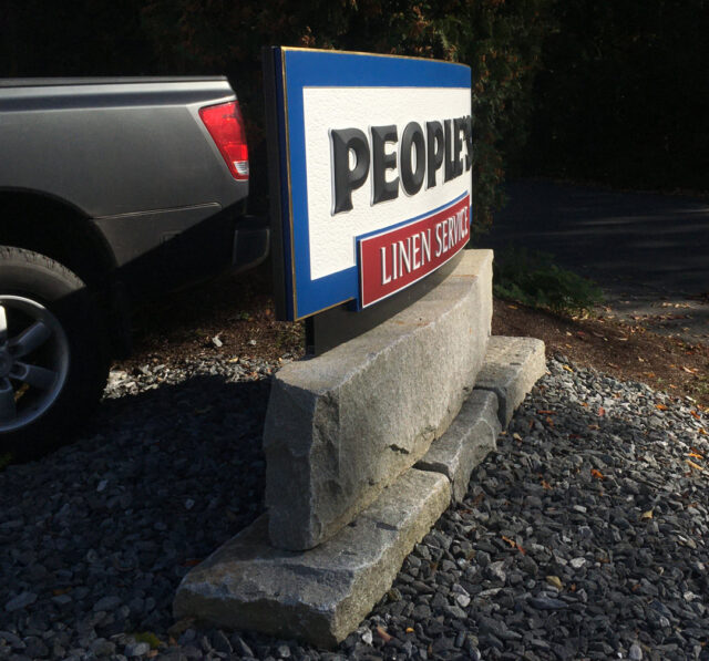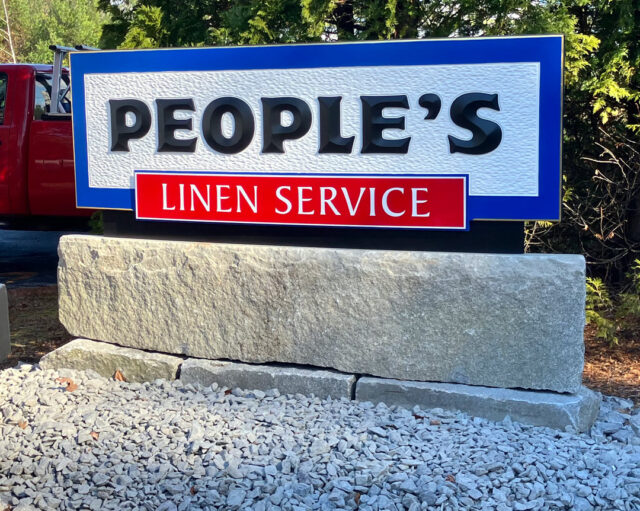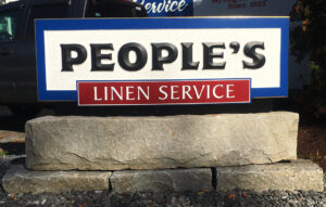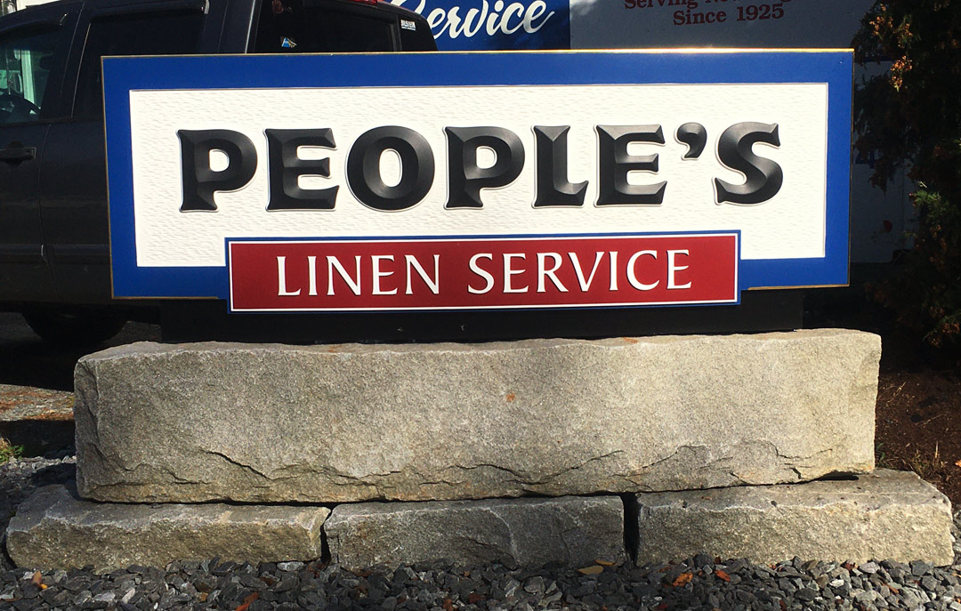 “The sign panel is 87-by-30-in. and about 5 inches thick. ‘People’s’ is done in prismatic HDU letters on the chip-carved HDU background. ‘Linen Service’ is a raised ACM panel with ¼-in. white PVC letters, and the cove border is finished with 23K gold. The black base that you see below the sign face is actually the aluminum composite material that wraps the structure that holds the face.”