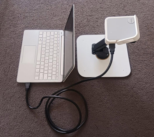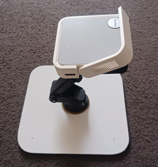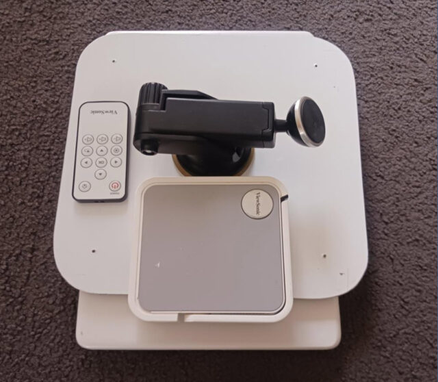 Here you see it set up on the small adjustable plastic stand on a small piece of ACM. I find this easier as it provides a solid base. It also allows you to move the projector around freely so that you can position the image you’re projecting optimally on the format.