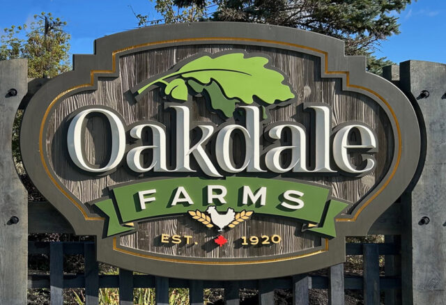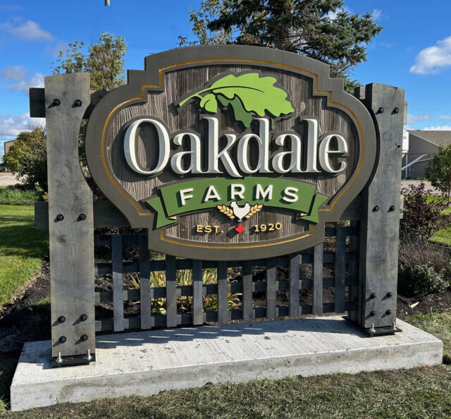 For this farm sign, we were shooting for a design that was appropriate and impressive. At 92-by-62-in., the sign is large and colorful, yet tasteful. The oak leaves fit well with the name, and being an egg farm, the chicken was also tucked into the layout.