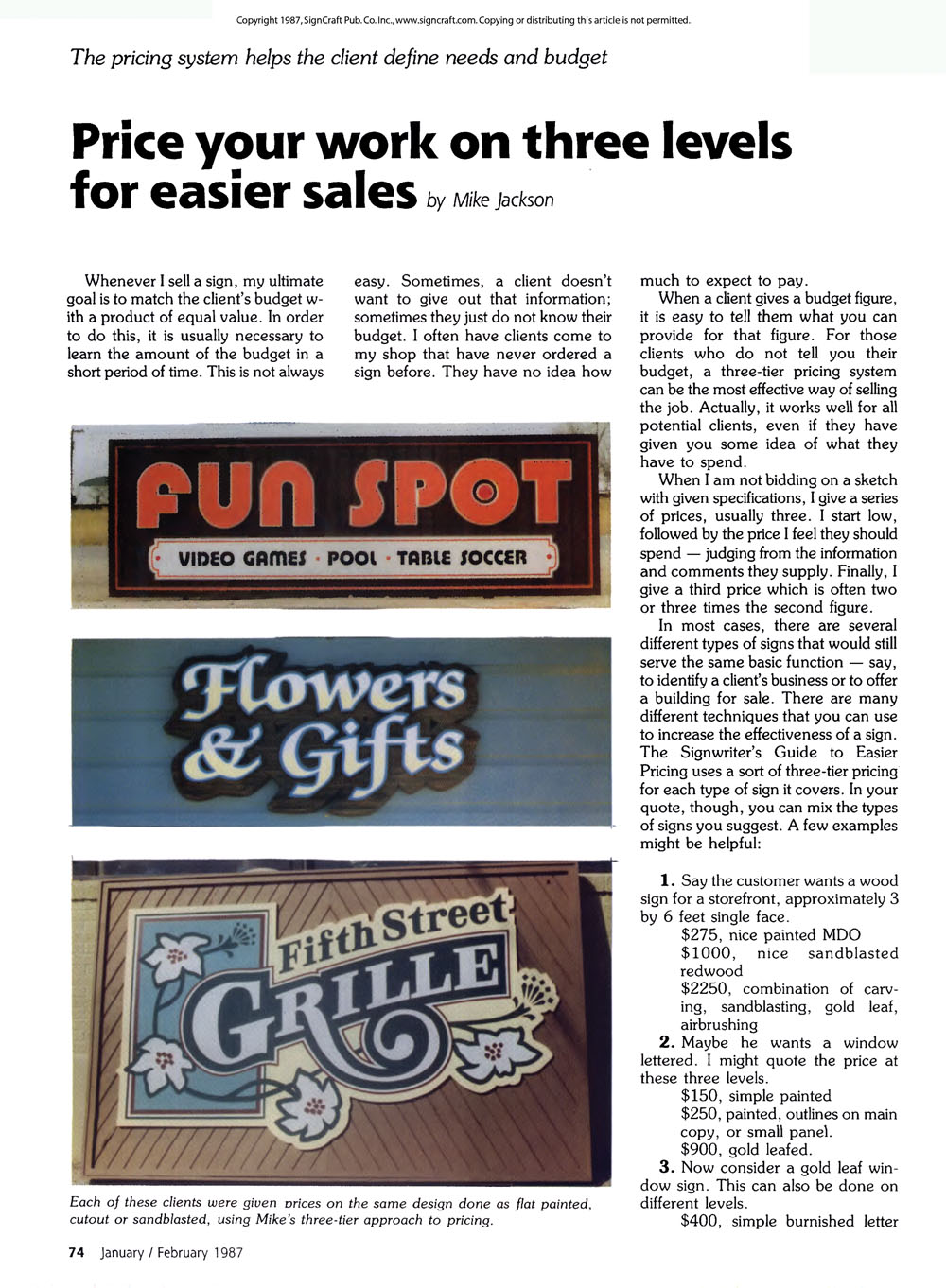 Thirty years ago, Mike Jackson wrote an article called Price your work on three levels for easier sales for SignCraft. Those two pages… Read More