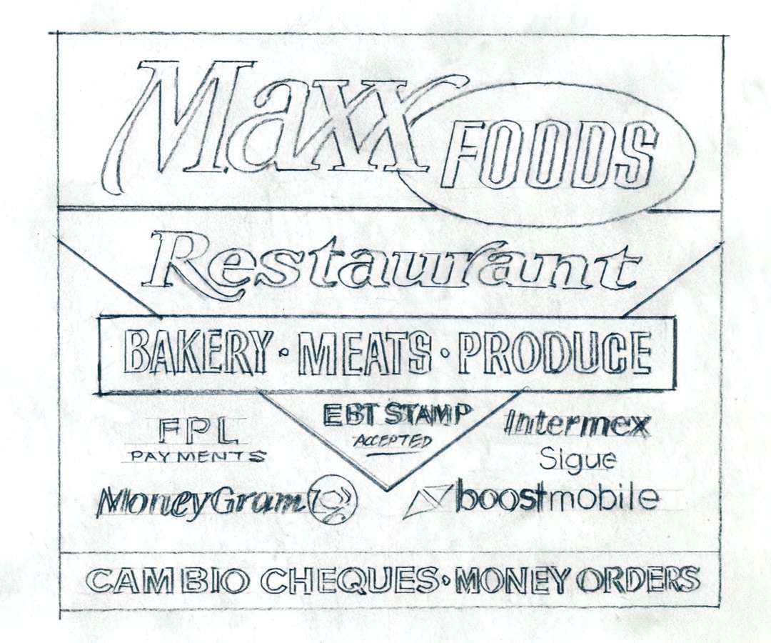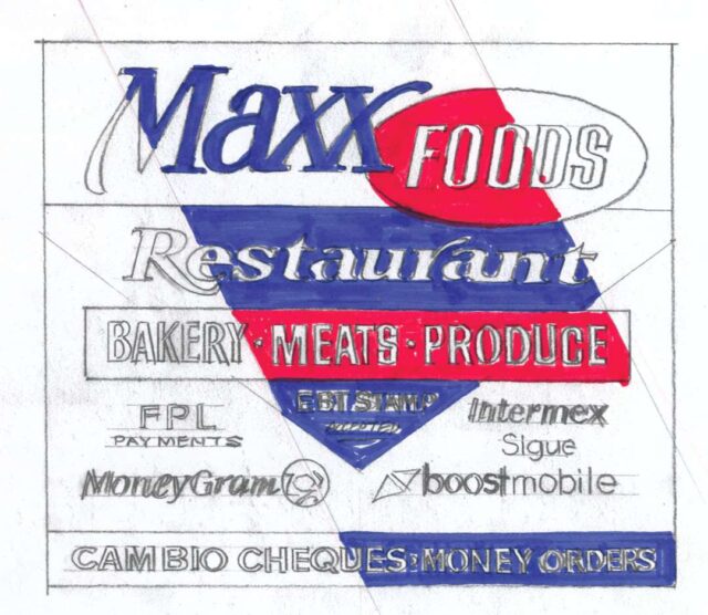 So we’ve given Maxx a stylized look of its own. That same style was then transferred to the dominant product, which we’ve decided is Restaurant. Those two words will read together as Maxx Restaurant. Our plain word, Foods, will qualify the other services for the next time customers pass by. Utilizing the same typestyle as Foods, that message will read together as one also: Foods—Bakery, Produce & Meats.