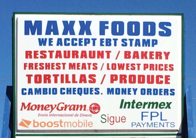 Now for the list of services. We have six services plus three money-related features: EBT stamps, money orders and check cashing. Separating these two groups will help our readers get the information in the order we want them to get it. Remember that at 45 mph, we have about two seconds to comprehend a message on this sign. Anything after that will have to be reviewed the next time the viewer passes by.