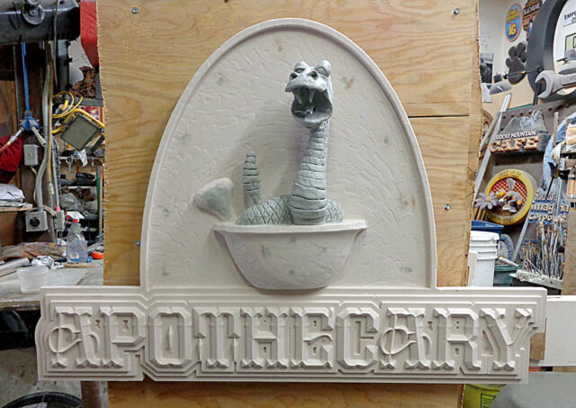 Once the machine routing was done and the sign assembled it was time for hand carving and sculpting. Care is necessary as the rapidly moving air-powered die grinder bit vaporizes the HDU board in an instant.