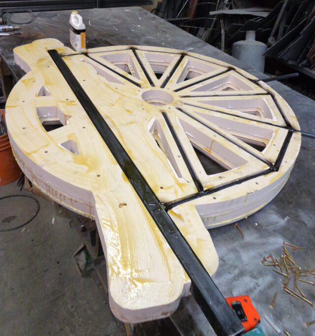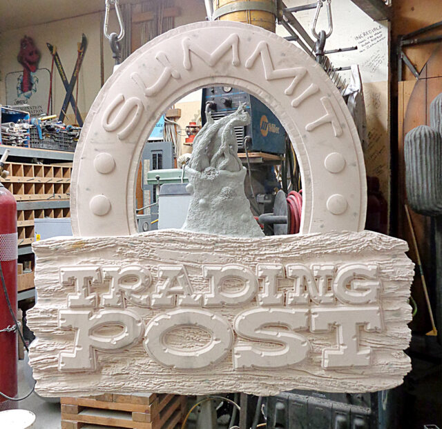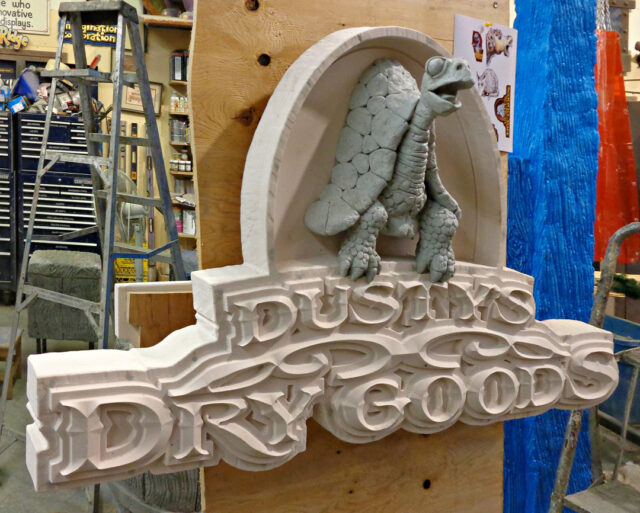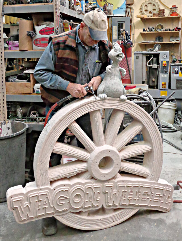 The signs are created using a variety of materials, including steel, sculpted fiberglass-reinforced concrete, routed 30-lb. Precision Board HDU board and plenty of Abracadabra Sculpting epoxy. We create digital routing files using EnRoute Pro software, machine the pieces on our MultiCam CNC router, and weld up the sturdy steel frames to laminate inside. Once assembly is done we then hand carve, sculpt and paint. It is quite the process.