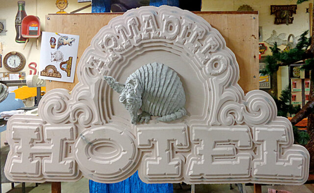 The hotel is the largest and tallest of the three storefronts. This place of business needed the fanciest sign of all. Some curlicues add a flourish and go with the old west (and slightly worn) lettering style. The armadillo was a great deal of fun and was a joint project by Peter and me.