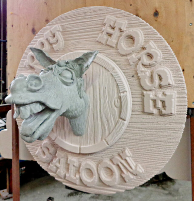 The horse obviously needed to be happy. The background was routed in two layers. I then cut the profile of the horse head in 2-in.-thick HDU board and sculpted him over that.