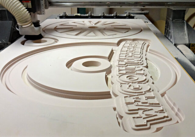 The routing files for the signs were created using EnRoute Pro 5, then sent to the MultiCam CNC machine. Each sign has three to six layers. The outer layers are routed with textures and letters; the inside sections are often simple cutouts.
