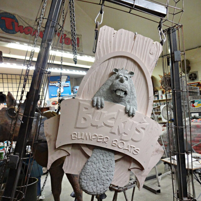 Once the main body of the sign is done, it’s time for the real fun: sculpting. With the freedom offered by our client we can simply have fun creating memorable and lovable critters for each attraction and building.