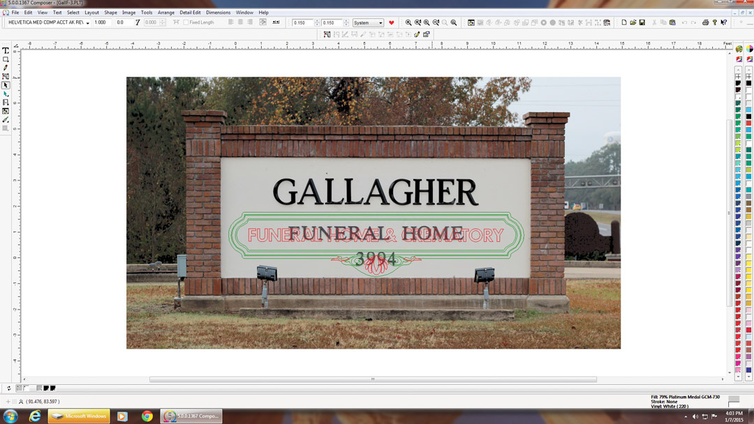 Since getting the sign completed quickly was important, I chose aluminum composite material for the panel. It’s prefinished, so this saved the time of painting the background. ACM is also lightweight and easy to attach to the stucco-over-foam surface.