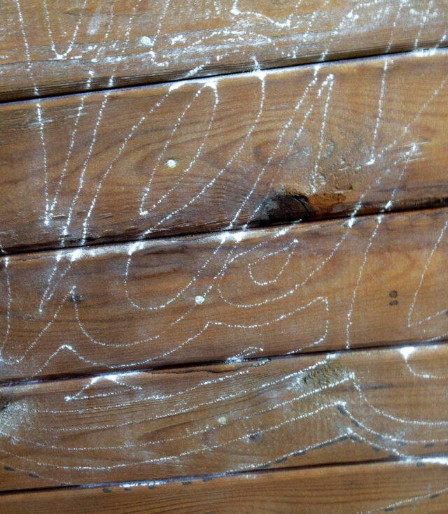 It was hand painted from a pattern and aged with a crackle effect done with Elmer’s Glue and clear acrylic. [See “Create a crackle finish background using wood glue”.] The new pine boards were aged with a solution of steel wool that was dissolved in vinegar. I soaked the steel wool in vinegar for two days to create the stain.