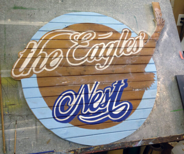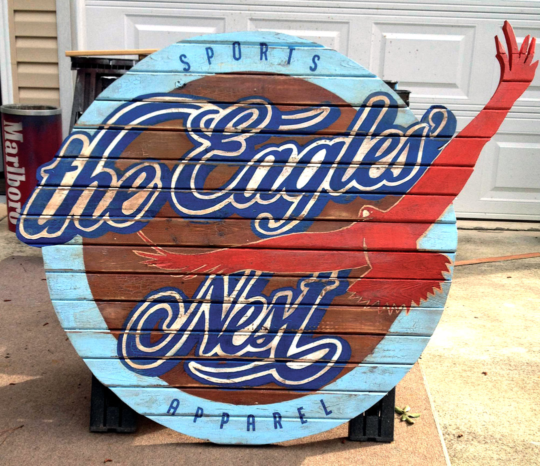 I produced this sign for a retail sporting goods store, which was used as an interior display. It’s about 32-in. in diameter and features an aged version of their logo.