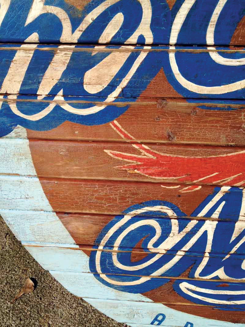 Letter the panel: 3 hours I hand lettered the panel, using Nova Color acrylic paints and acrylic latex house paint. Hand lettering delivers a vintage look and is the easiest way to handle graphics on a surface this rough.