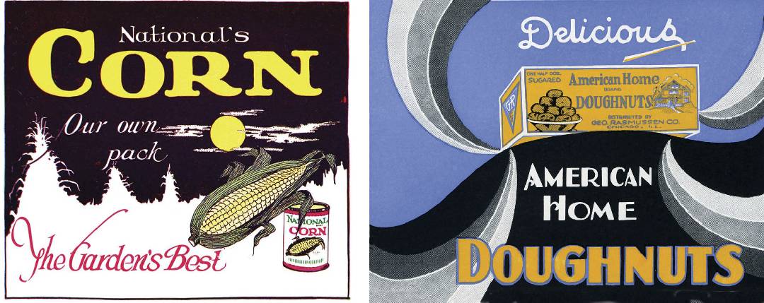 Early packaging design stressed the product first, over the manufacturer. This color illustration is from a 1939 edition of Silk Screen Methods of Reproduction by Frederick Drake & Co. of Chicago.