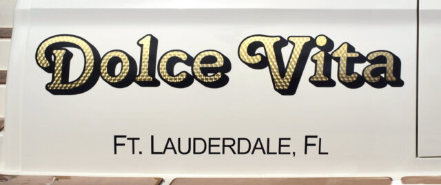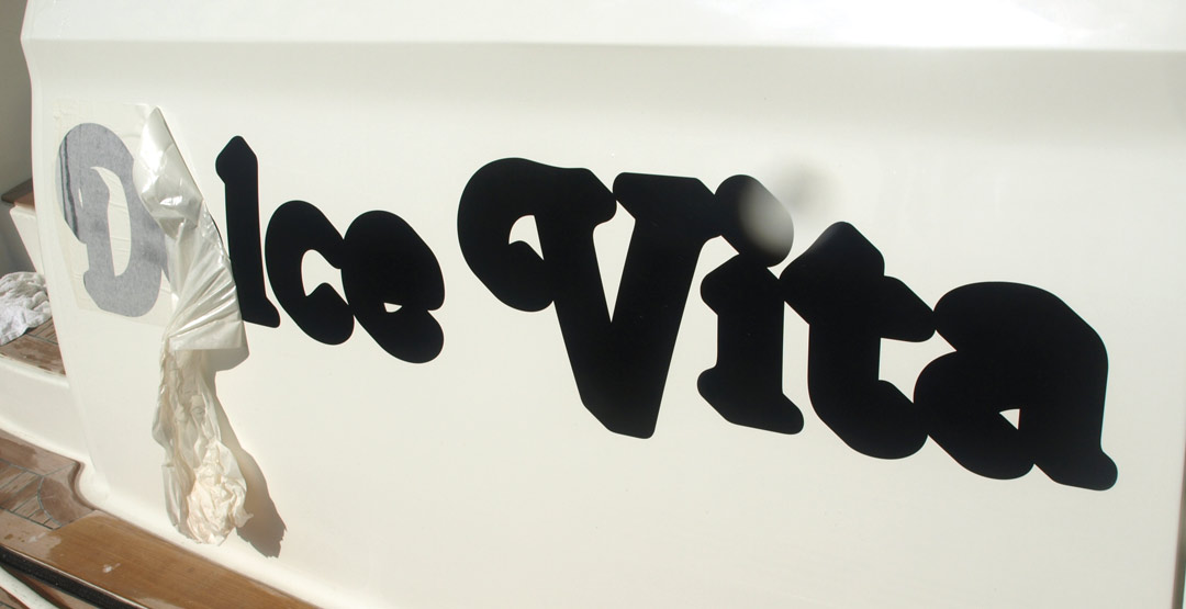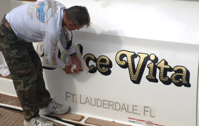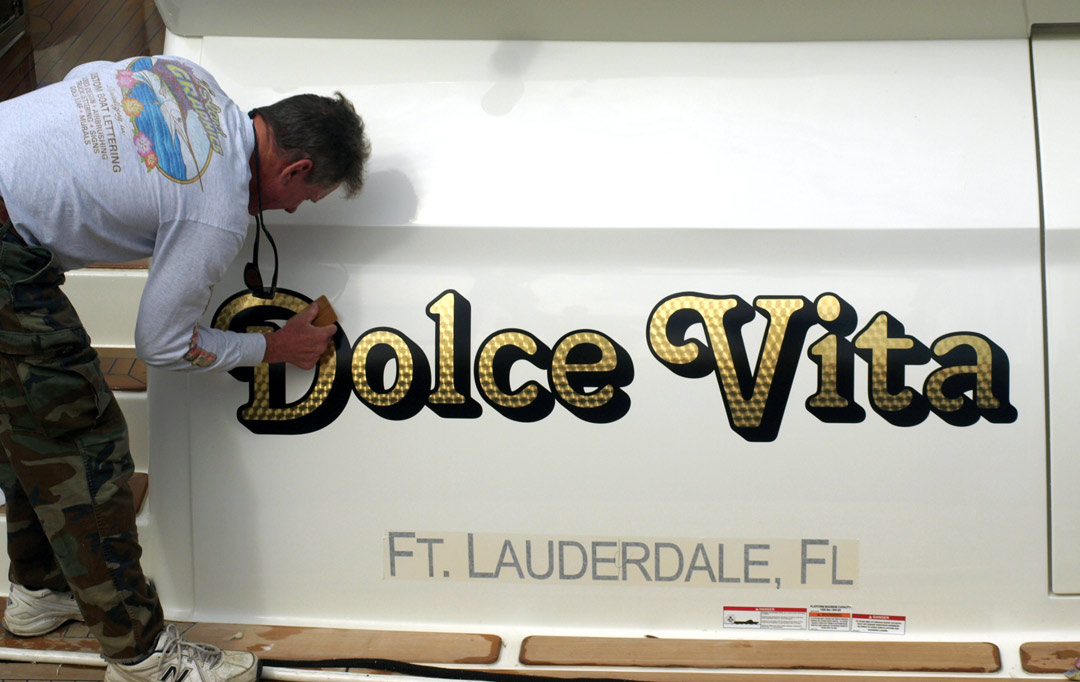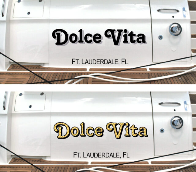 Normally customers get used to seeing their boat’s name in one font, and it’s difficult for them to switch to another one. However, depending on the new boat or color scheme, I have often been able to up-sell the project by showing them a sample of 22k RealGold vinyl [www.realgoldinc.com]. They usually love the look, and the advertised 15-year life helps convince new customers of the added value of upgrading to RealGold vinyl.