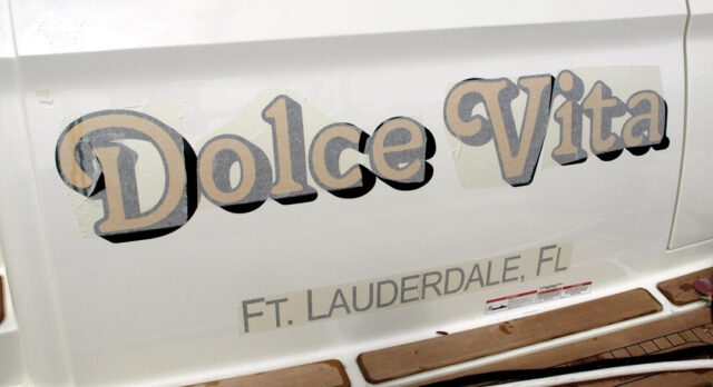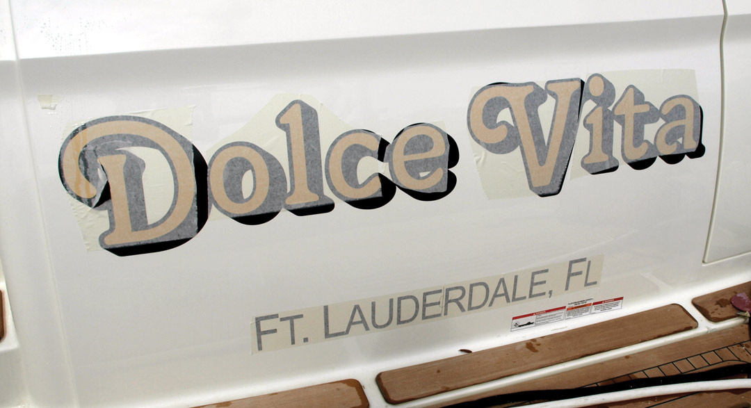 When I received an email from a salesman at Sea Ray I was happy to hear they had a new 65-footer that needed a name on it. The email included a photo of the customer’s previous boat showing the name and letter style he wanted used on the new boat. The name was black with a gray drop shadow in the Tango font.