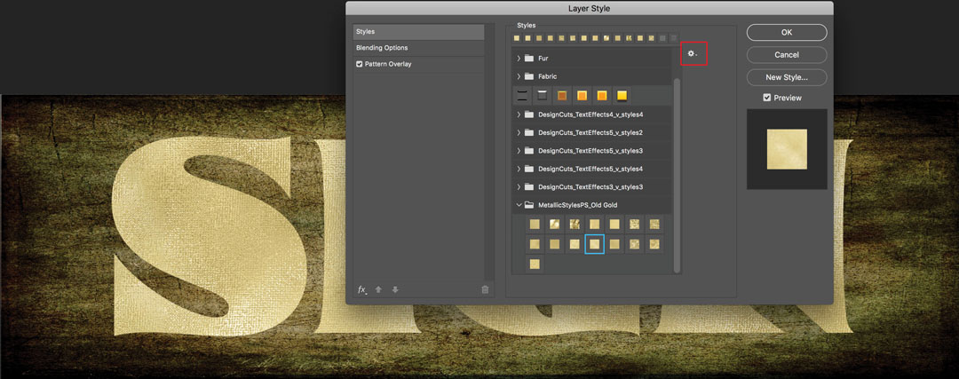 To add Layer Styles from other sources, click the gear icon, and select the Load Styles option. Navigate to the folder on your hard drive that contains them and click OK.