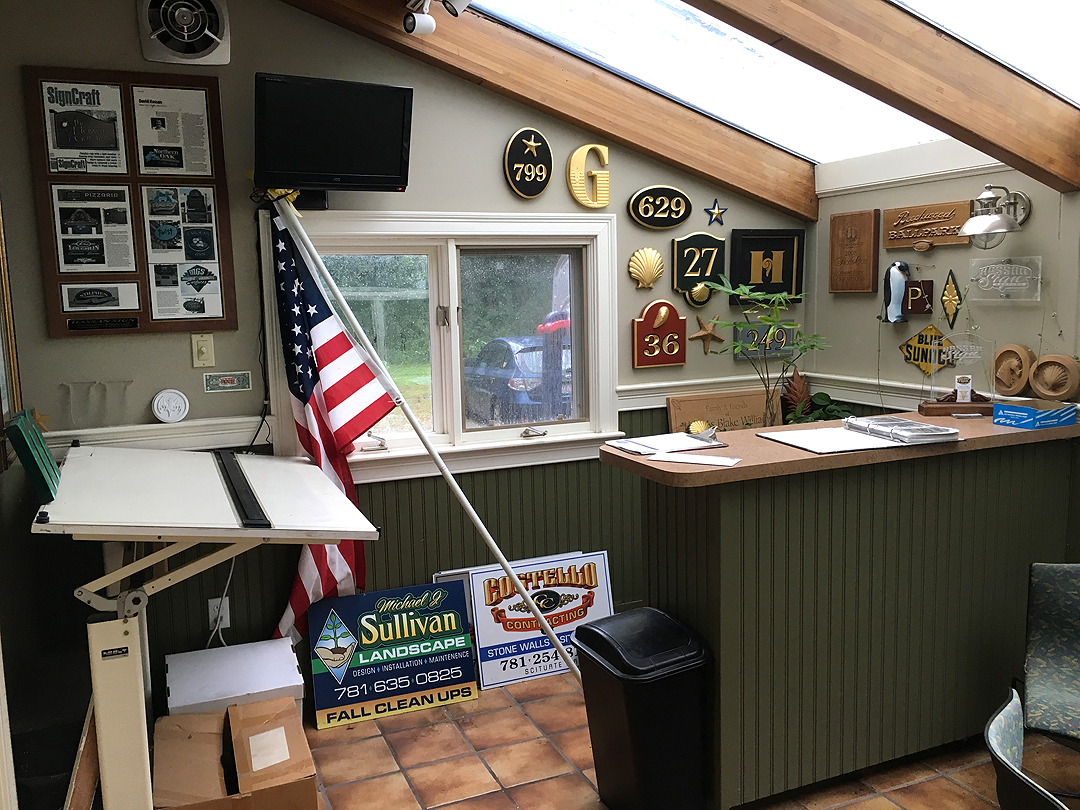 David Hassan [Hassan Signs, Cohasset, Massachusetts] has plenty of samples around his sales counter. The video display above the window is connected to a DVD player and shows images of his work to waiting customers.
