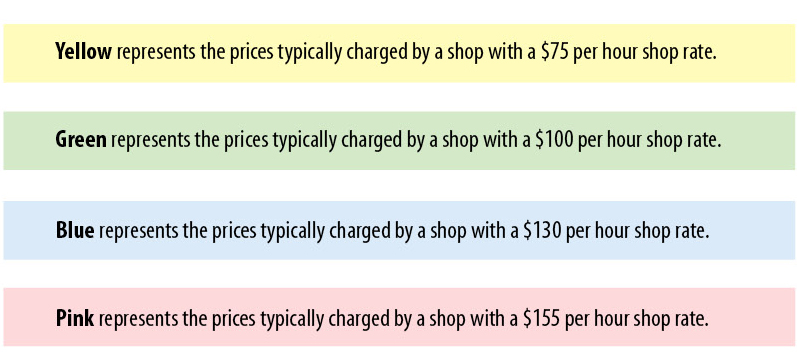 In our pricing surveys, we found most shops that listed an hourly “shop rate” they used in their pricing fell close to the four levels shown here. The prices of some of the respondents’ fell in the category above or below what they considered their hourly shop rate. Depending on a shop’s efficiency, that’s surely possible. Again, if that happens to you, do some careful job costing to make sure you’re not missing anything. Then double-check your overhead to make sure everything is covered.