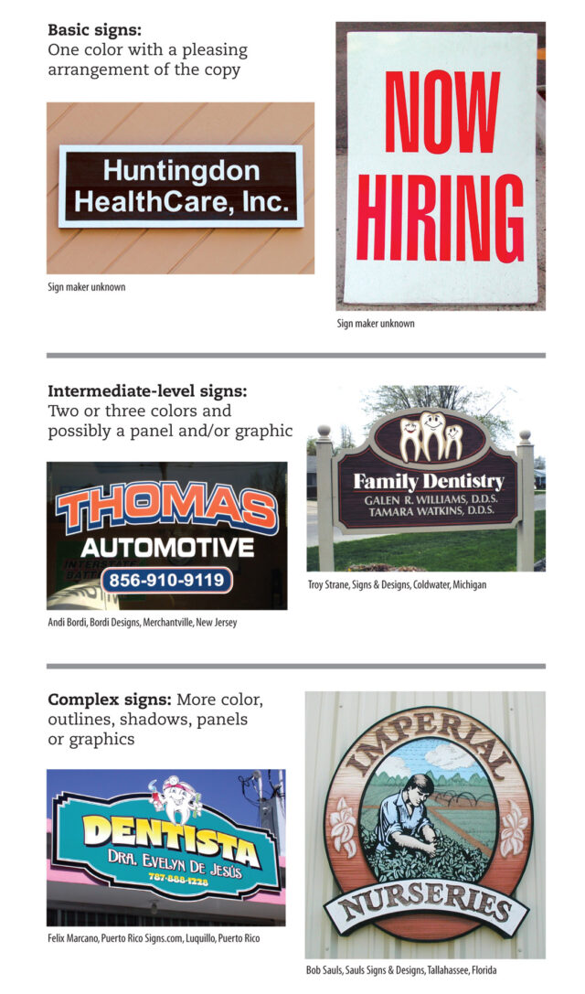 Intermediate: Two colors and possibly a panel, border and/or a simple graphic. There’s a little more time for layout and production here, and the result is a more appealing, more effective sign that has some degree of advertising value. In many shops, this is considered an average job. It may involve slightly more materials than a Basic version—and roughly 50% more production time.