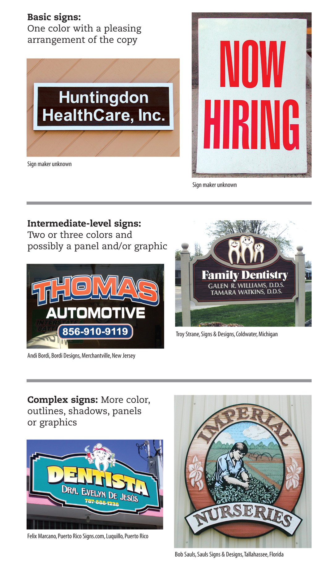 Basic: Pleasing arrangement of the copy, usually in one color on a white background and produced as efficiently as possible for a customer on a limited budget. These are typically informational signs with a minimal amount of copy and not very sophisticated in layout. Such jobs use the minimal amount of materials and time required to produce a clean, informational sign.