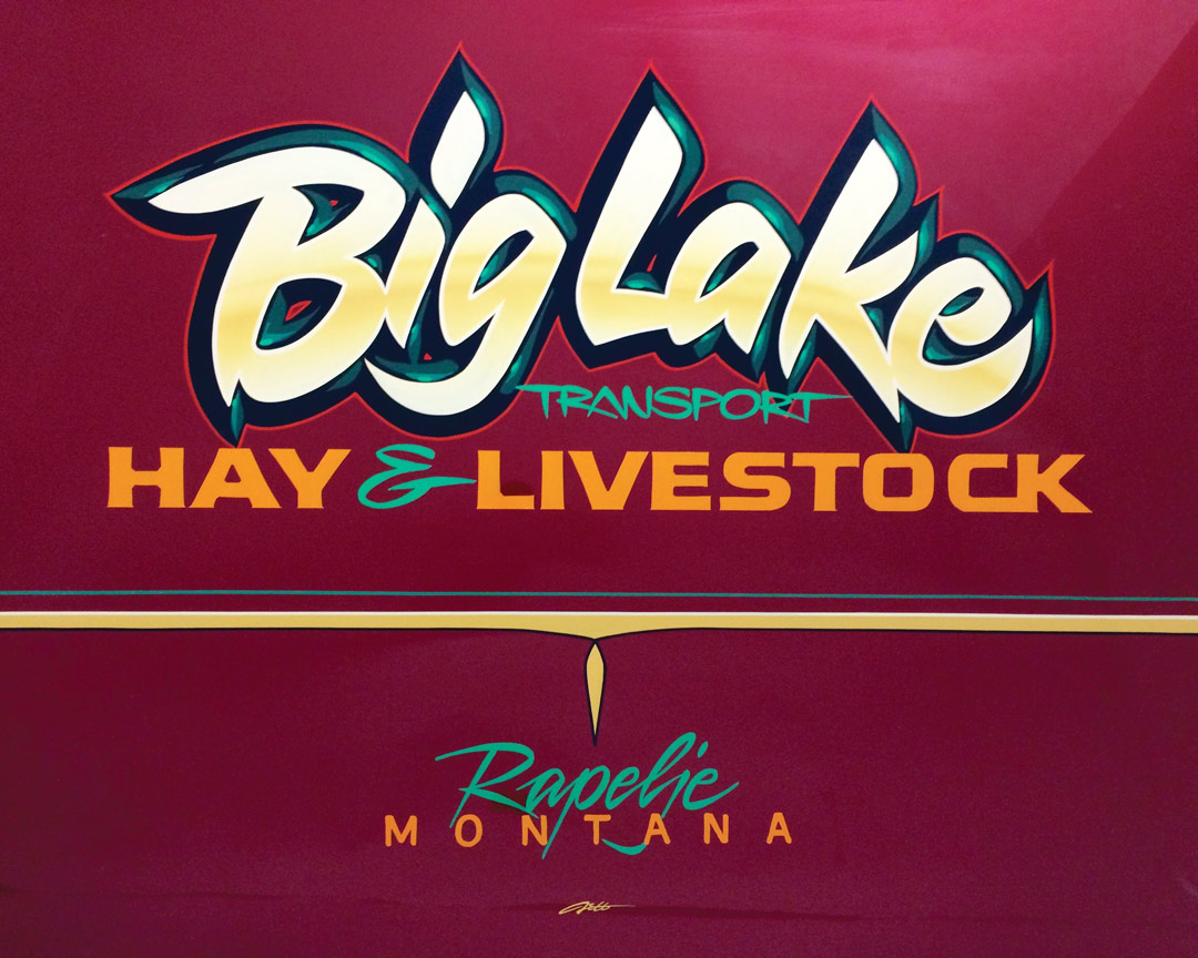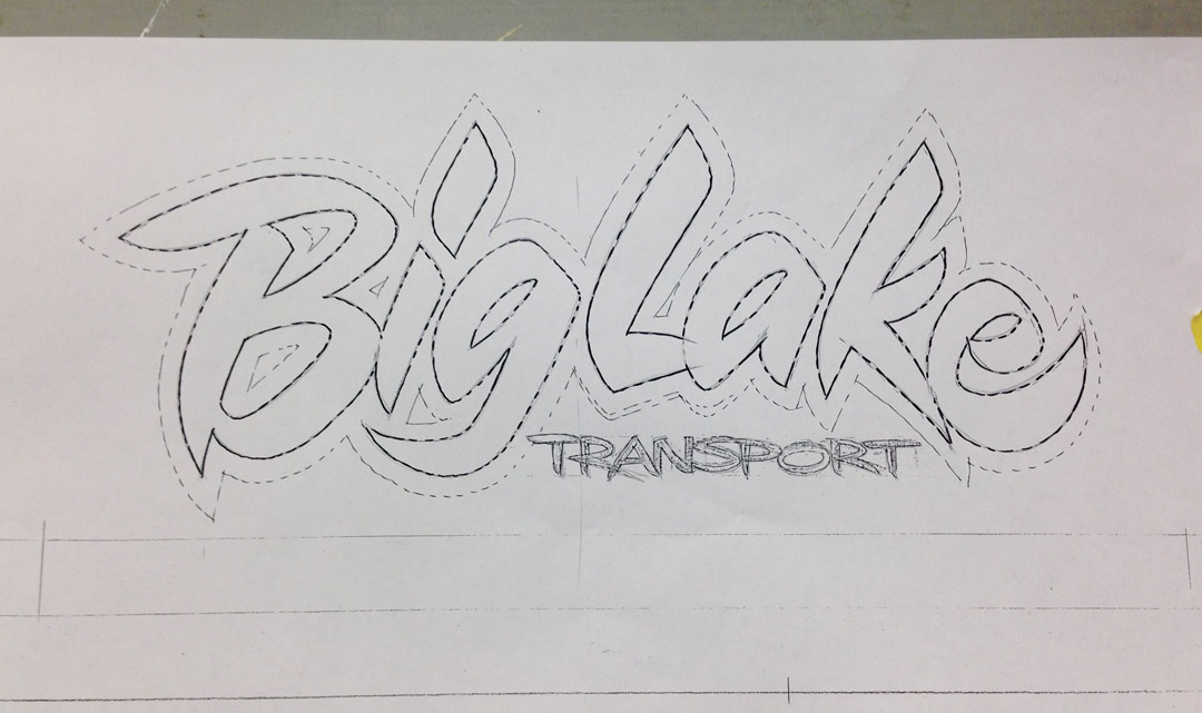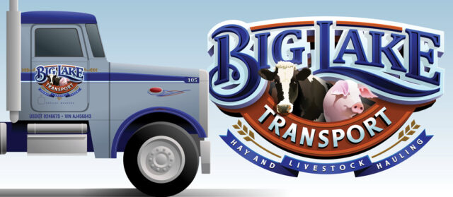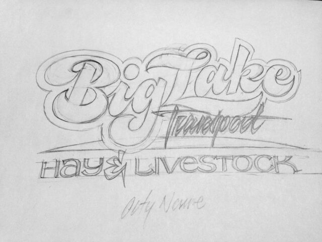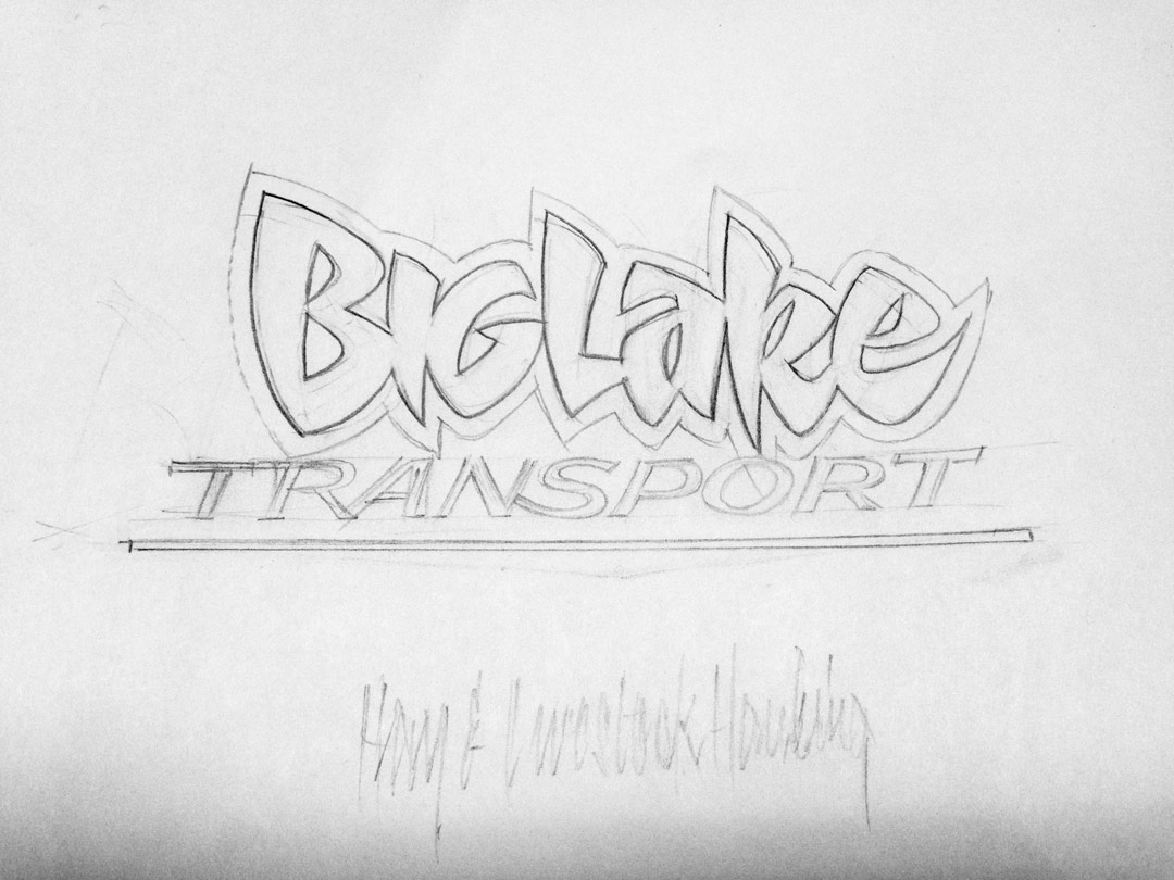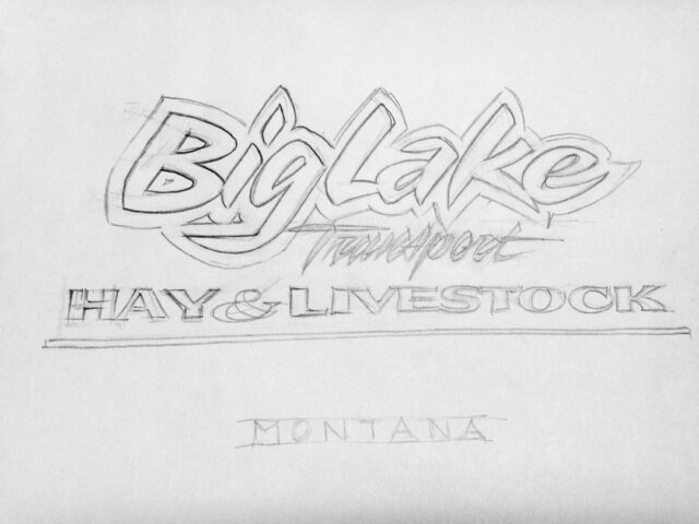 This was not an easy layout—a lot of copy for a semi door—so I’m sending several sketches of different layouts. The first thing I did was to prioritize the copy. “Big Lake” is the name, “Transport” is what they do, and “Hay & Livestock” is what they sell and service. “Hauling” is redundant to “Transport” so I would drop “Hauling.”