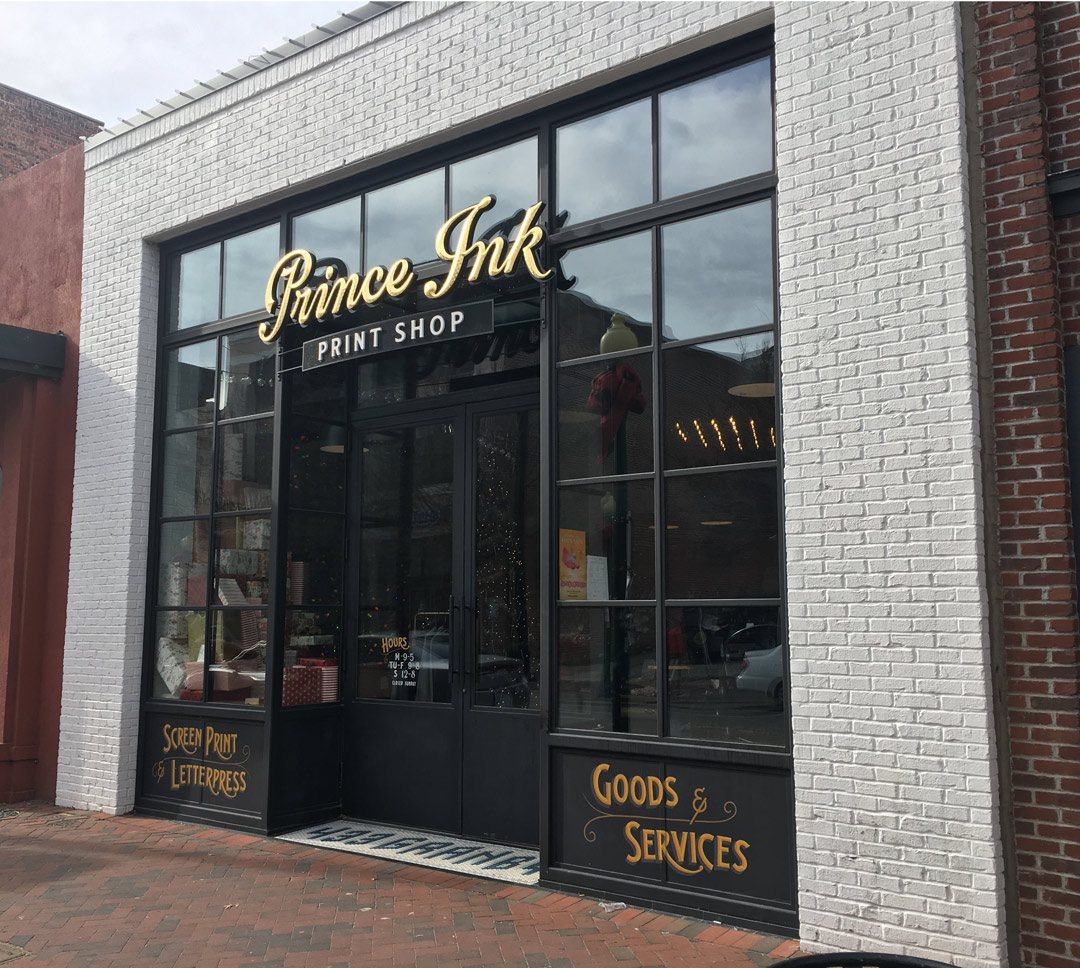 Such was the case at Prince Ink in Norfolk, Virginia. Their vintage building has an all-glass storefront framed by a brick outline that was equal on top and sides. Owner Matt Wallace talked with several sign companies, and all suggested a blade sign mounted to the brick, but he didn’t think that would have the impact he wanted.