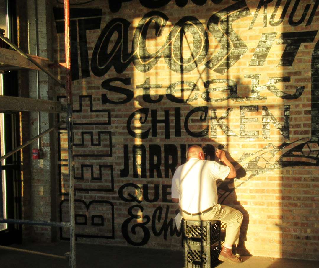 “There’s nothing high tech about wall lettering like this—it’s just a matter of skill, craftsmanship, creativity. It’s not really a sign, but more wall graphics meant to be part of the décor. It gives you something cool to look at while you’re eating your tacos or pizza.”